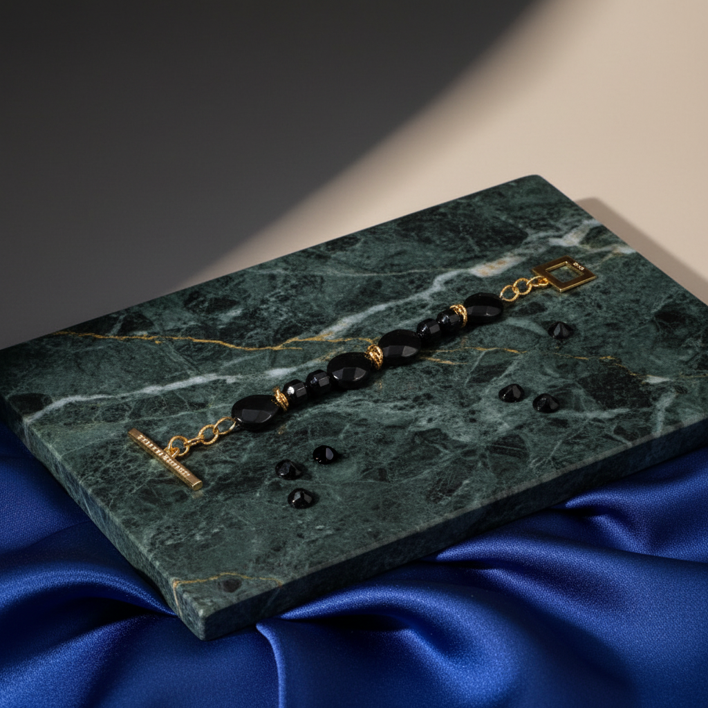 Elegance Shadow Armband är ett kraftfullt statement-armband där fasettslipade svarta onyx- och obsidian-stenar möter lyxiga gulddetaljer. De mörka stenarna symboliserar styrka och skydd, och de fint slipade fasetterade ytorna fångar ljuset på ett magiskt sätt. Ett smycke som utstrålar både mystik och elegans.