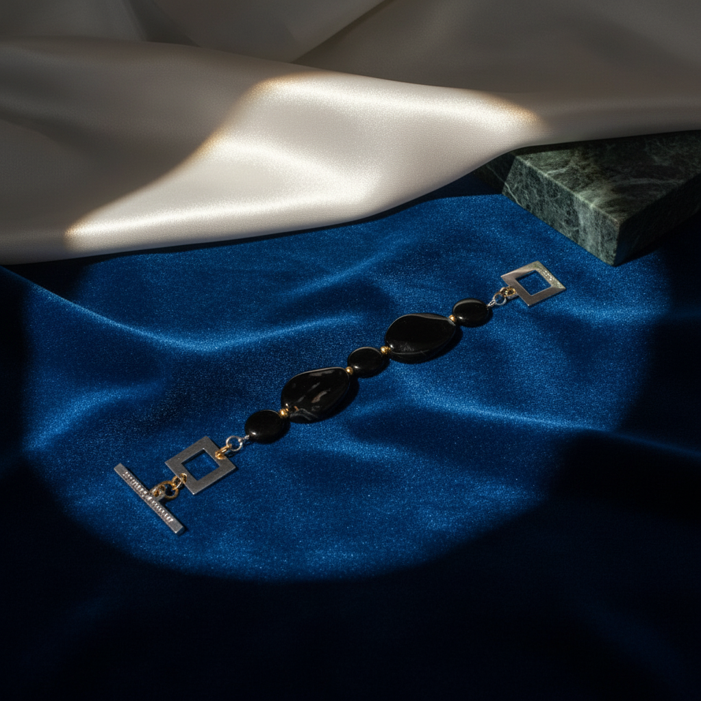 Luxery Shadow Armband är ett kraftfullt statement-armband där fasettslipade svarta agat-stenar möter lyxiga gulddetaljer. De mörka stenarna symboliserar styrka och skydd, och de fint slipade fasetterade ytorna fångar ljuset på ett magiskt sätt. Ett smycke som utstrålar både mystik och elegans.
