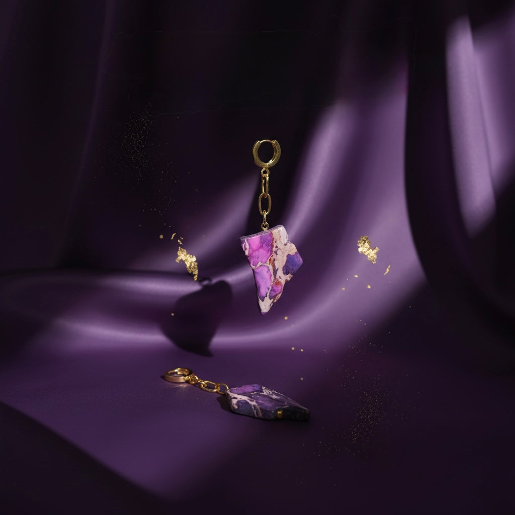 Purple Sky Örhängen är eleganta örhängen där äkta lila imperial jasper möter 18 karats guld. De vackra ädelstenarna i djupa lila toner skapar ett mystiskt och elegant uttryck. Ett statement-smycke som utstrålar både elegans och lyx.